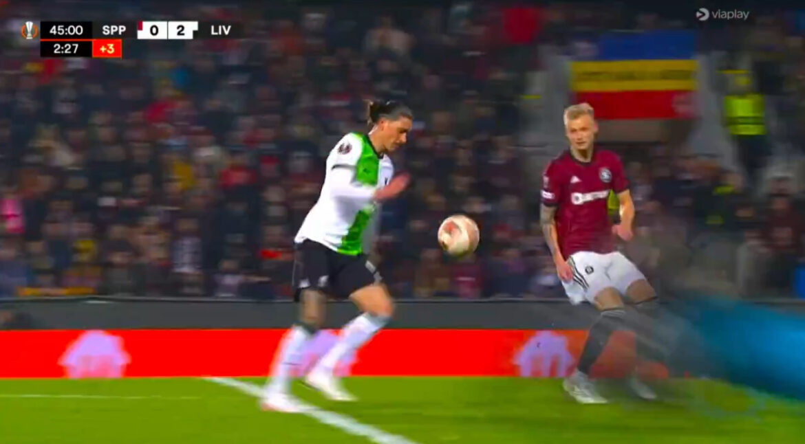 The stadium erupted with excitement as Nunezβs clinical strike found the back of the net, leaving the Slavia Prague defense stunned and helpless.