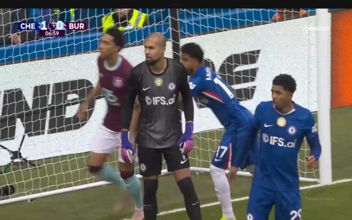 Chelsea fans are once more left raging over refereeing decisions, this time centered on an early incident that echoed the debates from earlier in the season. In the 7th minute, with the Blues already leading through João Pedro‘s fourth-minute opener (assisted by Pedro Neto), goalkeeper Robert Sánchez collected a floated cross from Burnley’s right flank. He went to ground to gather the ball amid pressure from Zian Flemming and a couple of Clarets forwards, shielded it briefly, then rose to his feet looking to launch a quick counter.